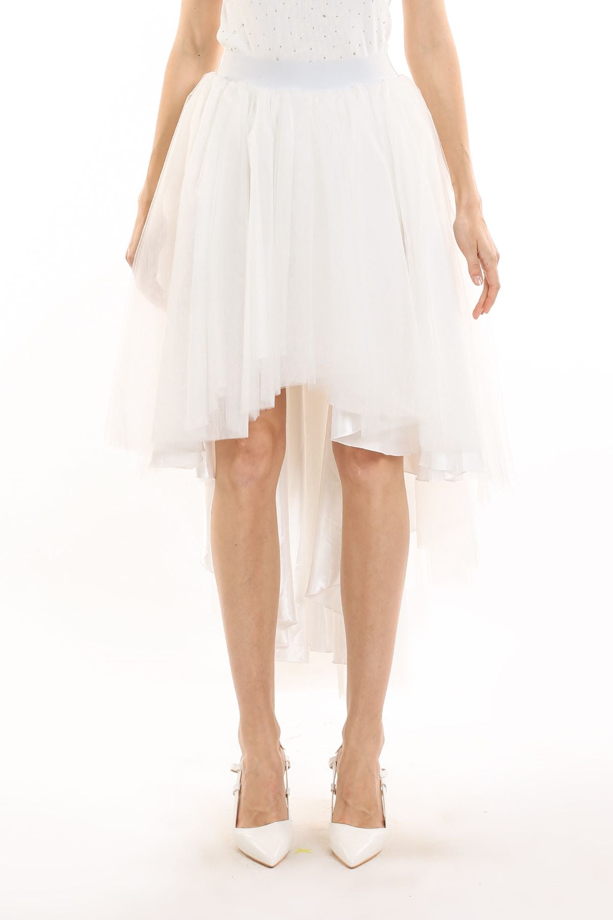 Indulge in the ultimate luxury with our White Tulle High/Low Skirt. Made with the finest fancy tulle, this skirt will effortlessly elevate any outfit. The flared design adds a touch of elegance, while the white color makes it a versatile piece for any occasion. Complete your wardrobe with this must-have statement piece.